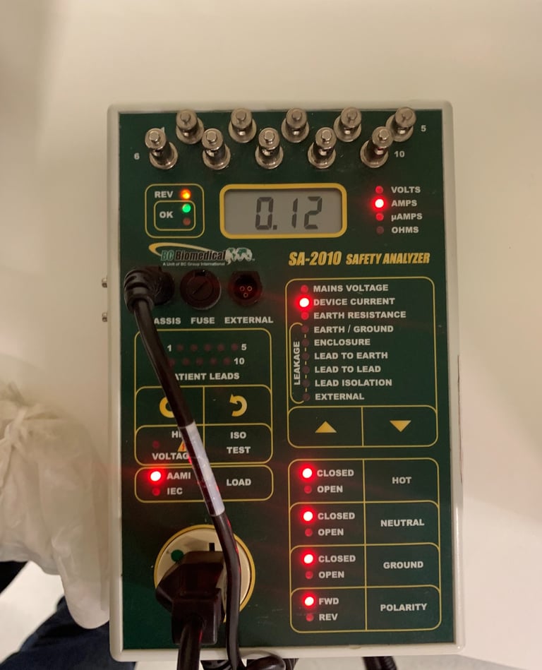 As imagens mostram analisadores de segurança elétrica sendo usados em bancada de testes em um determinado equipamento médico. O teste pode ser manual, sendo necessário o preenchimento de uma planilha por exemplo, o uso do analisador da BC Biomedical é utilizado nesta forma, ou ainda pode-se automatizar utilizando o analisador do modelo Tesla da Arkmeds que gera um relatório pronto com todos os valores medidos, bem como seus parâmetros e limites, e ainda tem a vantagem da possibilidade de adicionar a logo da sua empresa no cabeçalho, gerando muito profissionalismo no laudo.
